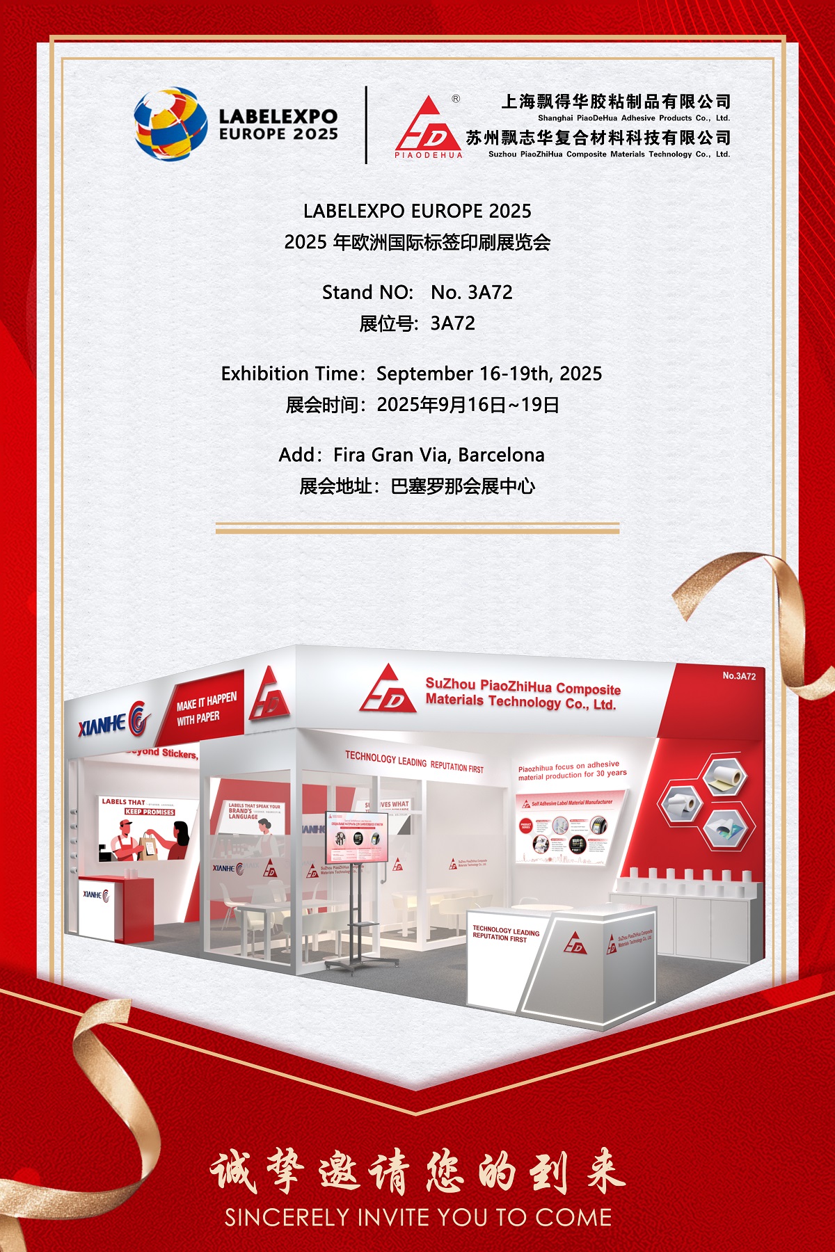 SuZhou PiaoZhiHua Composite Materials Technology Co., Ltd. は、2025 年 9 月 16 日から 19 日までスペイン、バルセロナのフィラ グラン ビアで開催されるラベルおよびパッケージ印刷の主要な国際見本市である Labelexpo Europe 2025 への参加を発表できることを光栄に思います。 30年以上の業界経験を持つ高性能粘着ラベル素材の信頼できるメーカーとして、Piaozhihuaはブースで革新的な製品ポートフォリオを展示します。 No.3A72 。この展示会では、消費財、物流、産業分野にわたる多様な用途に合わせた高度な接着剤ソリューションが展示されます。