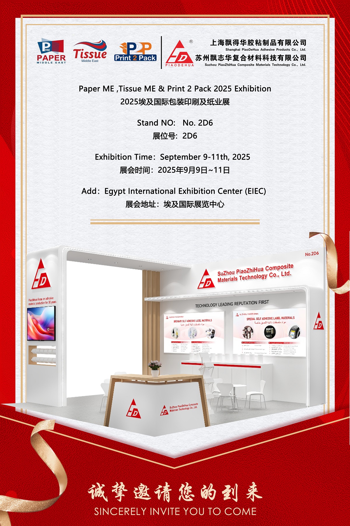 SuZhou PiaoZhiHua は、2025 年 9 月 9 日から 11 日までカイロのエジプト国際展示センター (EIEC) で開催される、パッケージング、印刷、製紙業界の主要な地域プラットフォームである Paper ME、Tissue ME & Print 2 Pack 2025 展示会に参加できることを楽しみにしています。粘着ラベル材料の大手サプライヤーとして、Piaozhihua はブース番号 2D6 で一般および特殊粘着製品の包括的な範囲を展示し、標準用途と要求の厳しい用途の両方向けに設計されたソリューションを強調します。